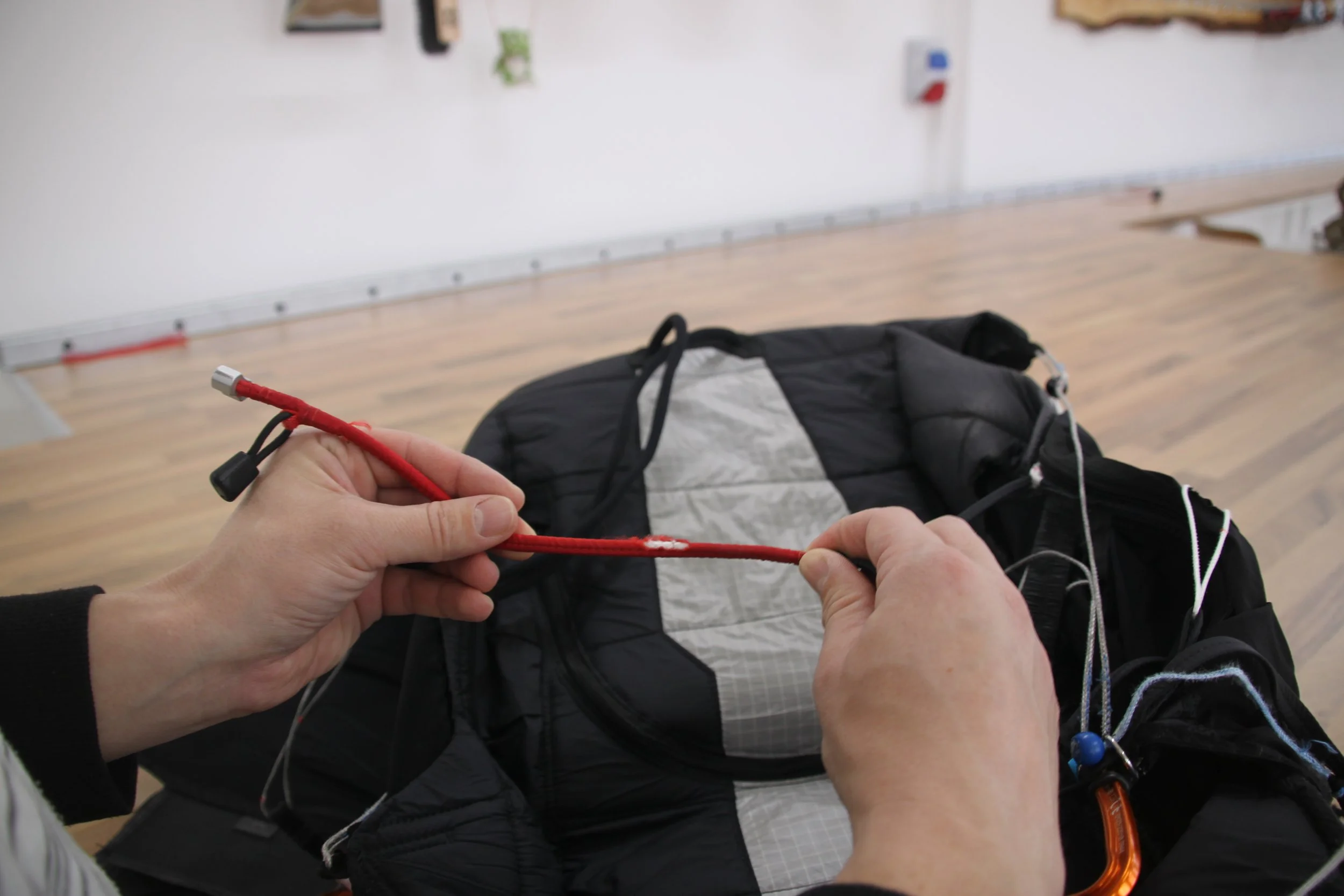 Überprüft werden alle sicherheitsrelevanten Teile, die die Verbindung zum Gleitschirm betreffen, sowie alle Sicherungsgurte, Schnallen und Teile, die das Rettungssystem betreffen.