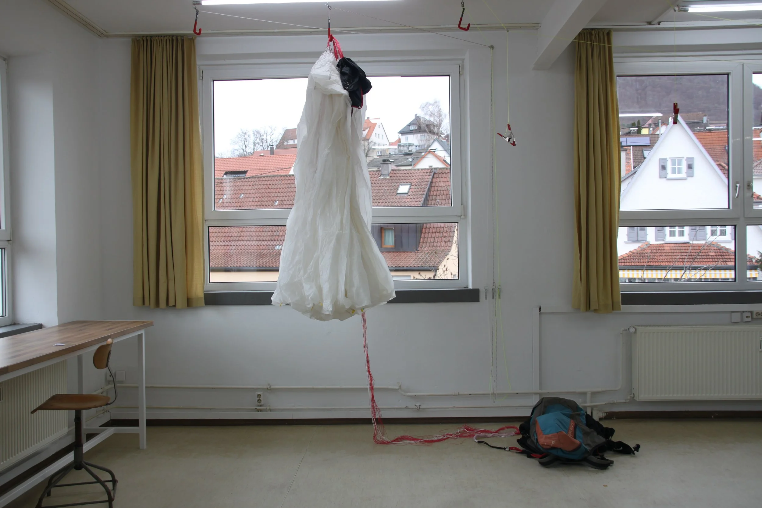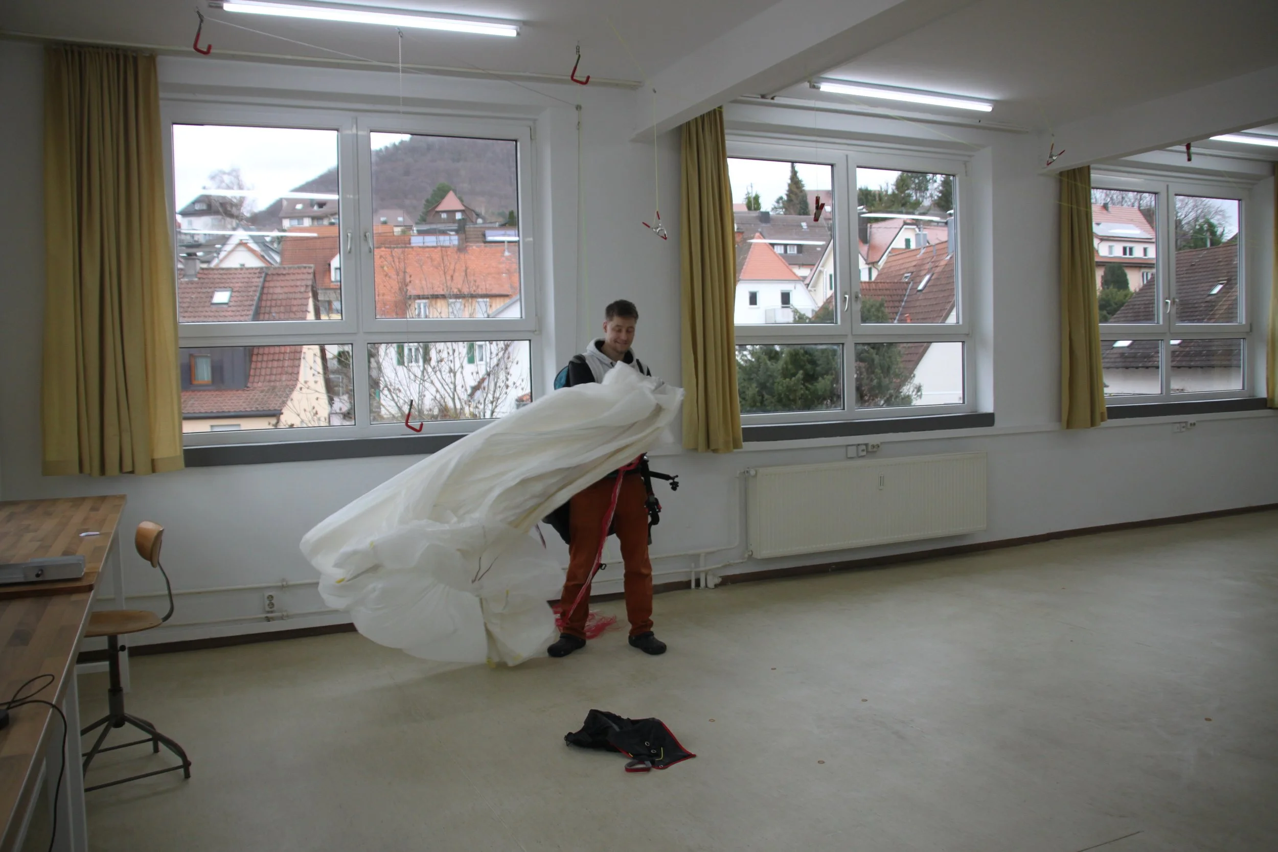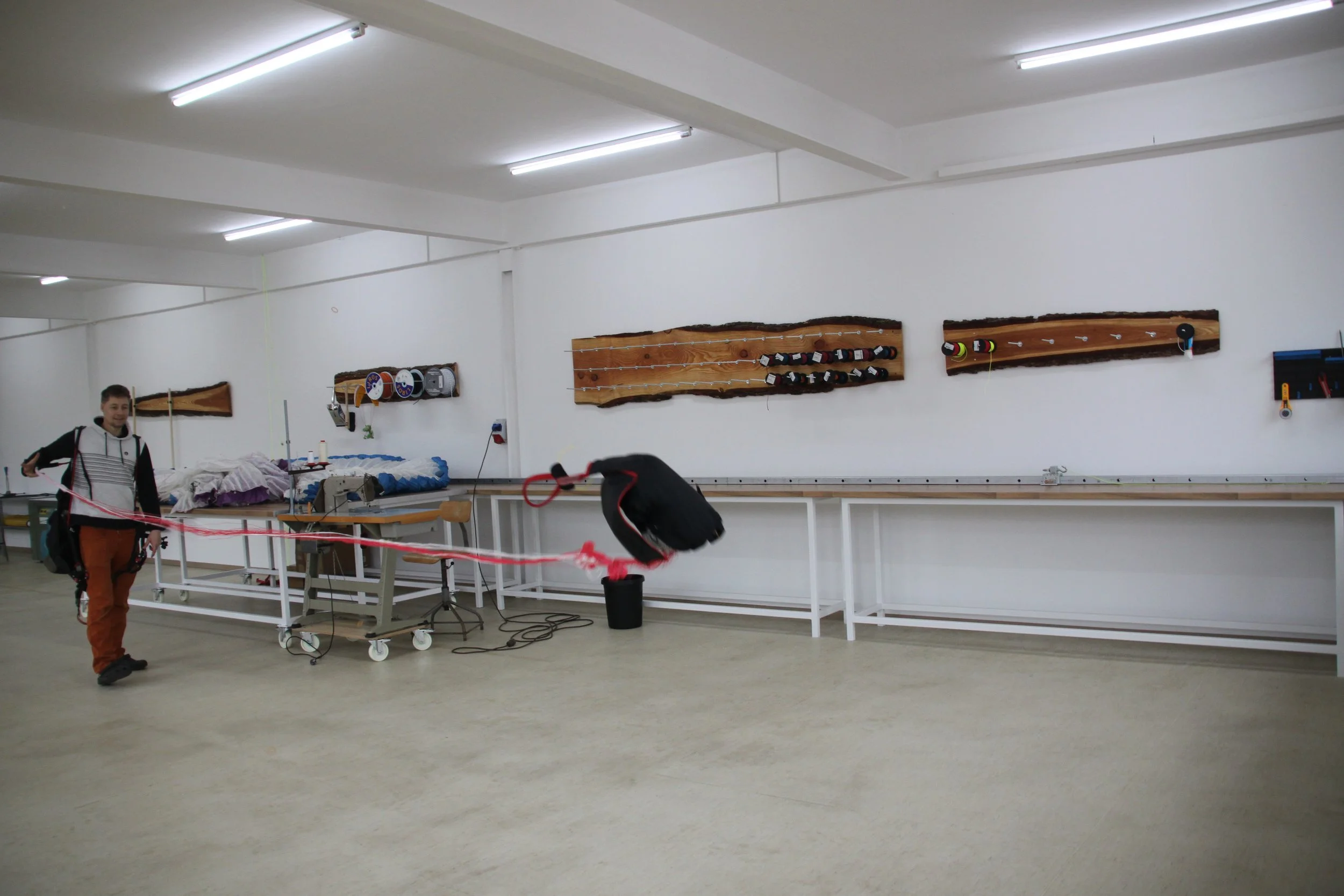 Zu Beginn wird jeder Rettungsschirm ausgeschüttelt, mindestens 12 Stunden über Nacht aufgehängt und gelüftet. Anschließend wird das Rettungsgerät wieder fachgerecht in den Container gepackt und mit K-Prüfung in Dein Gurtzeug eingebaut. Dabei werden ebenso die Packgummis, die die Leinen zusammenhalten und den Container verschließen, erneuert.